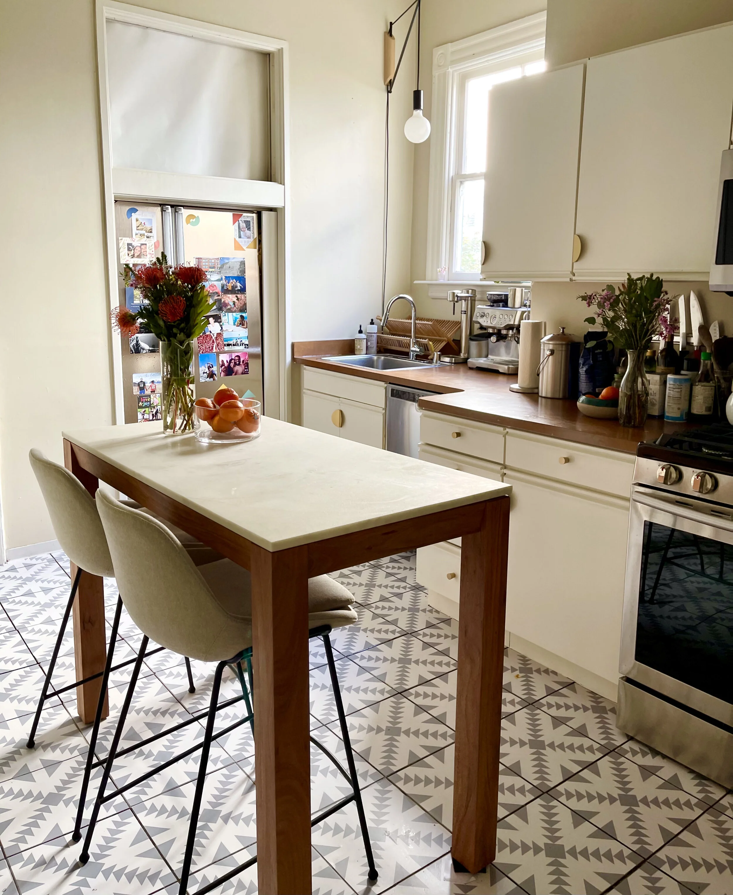 Since this space is a rental, we had a small budget and limited ability to move elements of the kitchen. We focused on brightening and cleaning up the space — with warm white colors and a functional light over the sink.