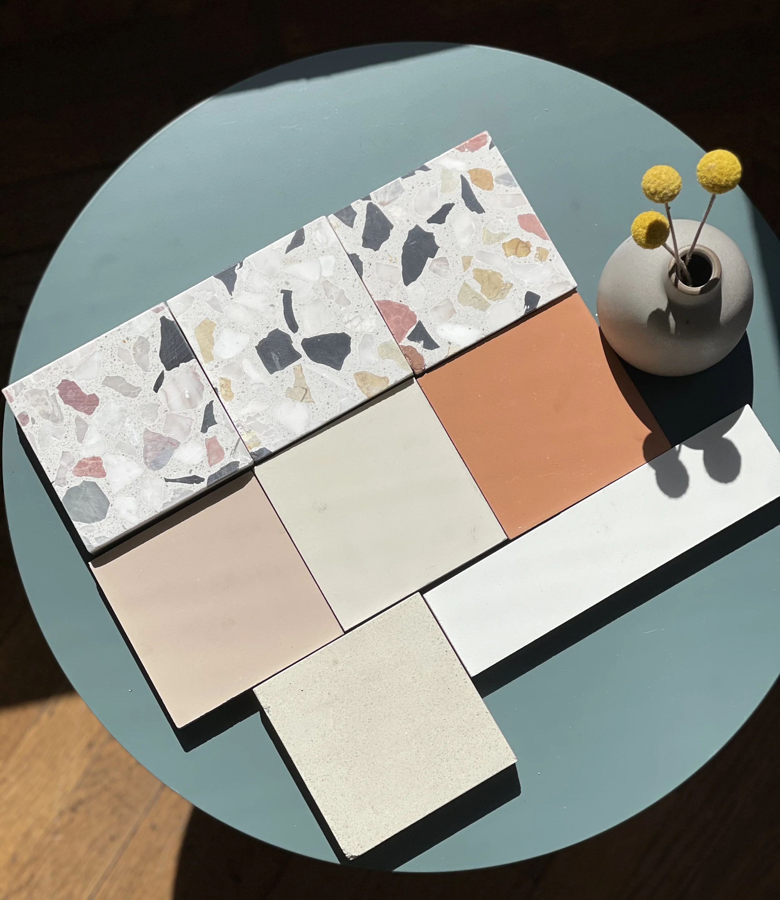 Tile samples from Zia Tile and Concrete Collective. We love the trendy terrazzos from Concrete Collective (the top row), especially the mix of colors to the top right. Ultimately, we chose a subway concrete tile in bone from Zia , to be laid vertically and placed in the hallway bathroom. Since the master bedroom has an en suite bath, we want to make sure the guests using the hallway bathroom feel like they have something special.